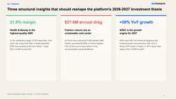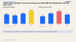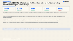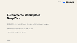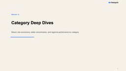 Deep-Dive · 10 slidesE-Commerce Marketplace — Deep Dive AnalysisFull marketplace diagnostic: category economics, return rate analysis, seller comparison, and regional performance matrix.Download PPTX freeGenerate a deck like this →