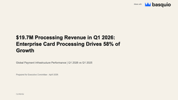 Memo · 4 slidesPayment Infrastructure — Executive SummaryQuick executive readout: $19.7M processing revenue, regional breakdown, and three strategic recommendations. Generated in under 2 minutes.Download PPTX freeGenerate a deck like this →